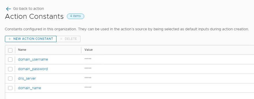 - Updated the action code so that credentials and DNS server information is pulled from Action Constants, to keep the ‘data’ private and abstracted from the code