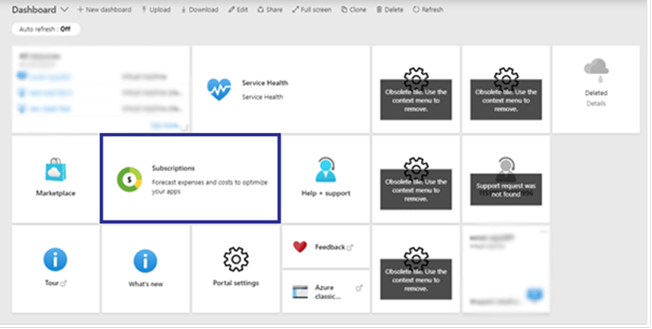 Login to your MS Azure portal. On the Dashboard click the Subscriptions card.