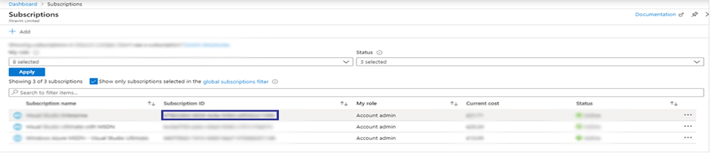Within the Subscriptions screen, make a note of the Subscription ID that you want to deploy virtual machines and services into.