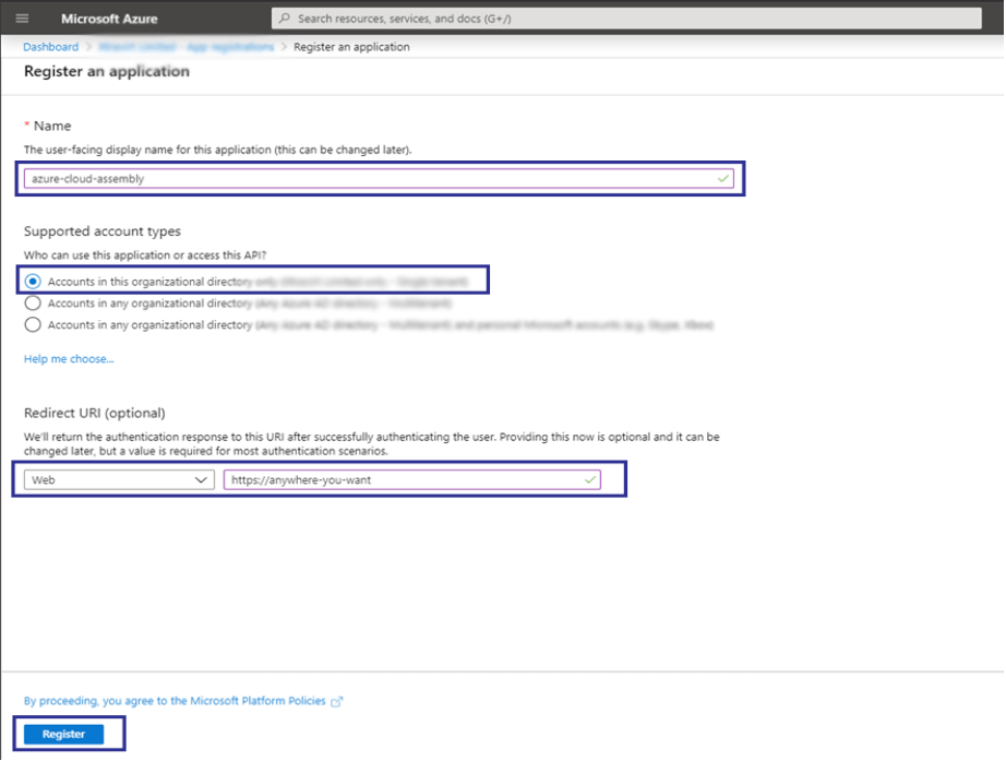 Register a new application. Specify a name, configure the Support account types (I used the first/default option) and set a Redirect URI. The redirect URI wont actually be used, so you can point this to any fictitious address you like, just as I have here. Finally, click the Register button.