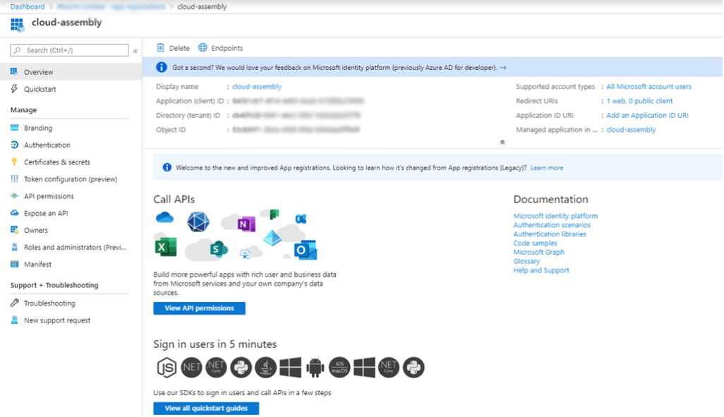 With our new application registered, make a note of the Directory (tenant ID). Click the Certificates & secrets menu entry.