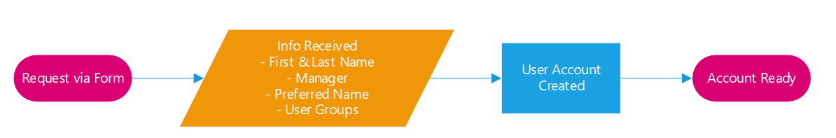 This is the same process as we saw earlier, but we have now applied standards. All requests for a new user must come in through a form, and this form has data fields that the requester must complete before submitting.