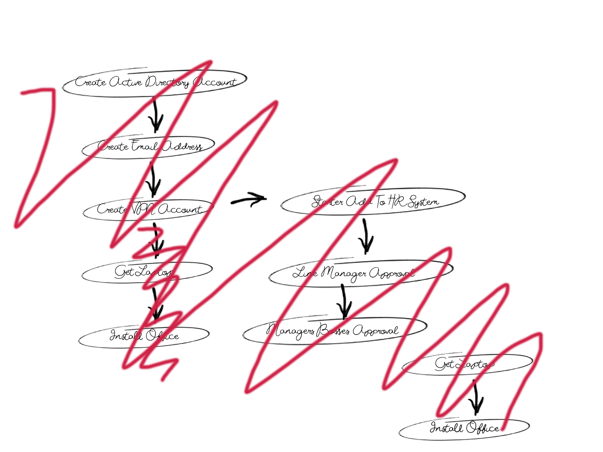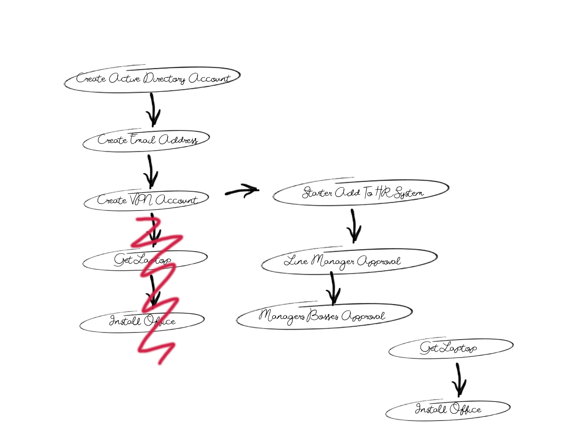 Over the next few months you speak to multiple vendors, trial some different tools and finally make a decision. You select a product set that will automate the majority of things you can think of. Breathing a sigh of relief you start dreaming of the future. Easy life, happier staff, automated everything. But, first things first. You need to prove this is going to work, so you decide to do a pilot. Picking on something easy, you decide to automate the new starter process. You map it out on paper and it looks straight forward.